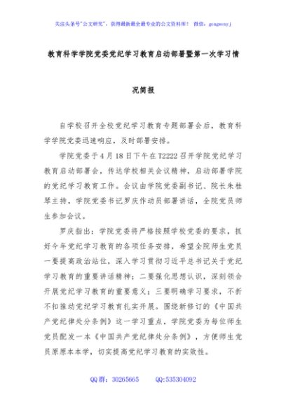 教育科学学院党委党纪学习教育启动部署暨第一次学习情况简报