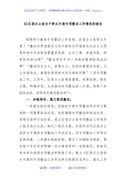 / XX区委办公室关于牵头开展专项整治工作情况的报告