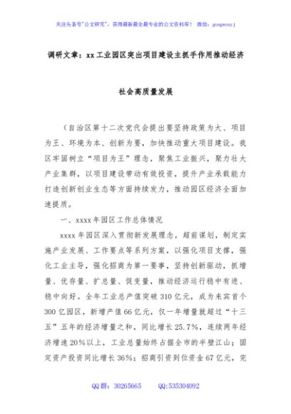 / 调研文章:xx工业园区突出项目建设主抓手作用推动经济社会高质量发展