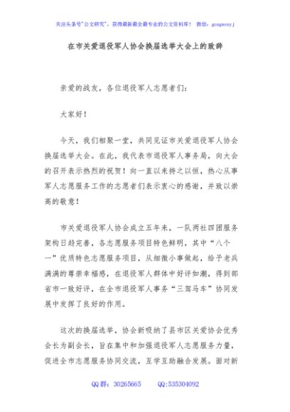 / 在市关爱退役军人协会换届选举大会上的致辞