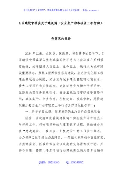 / X区建设管理委关于建筑施工安全生产治本攻坚三年行动工作情况的报告