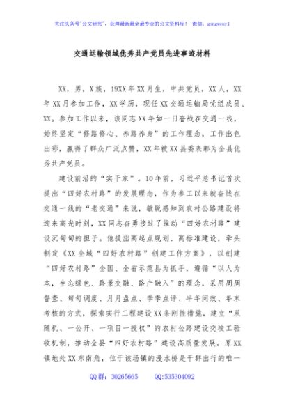 / 交通运输领域优秀共产党员先进事迹材料
