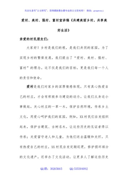 / 爱村、美村、强村、富村宣讲稿《共建美丽乡村,共享美好生活》