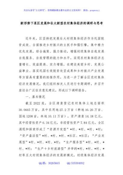 / 新形势下某区发展和壮大新型农村集体经济的调研与思考