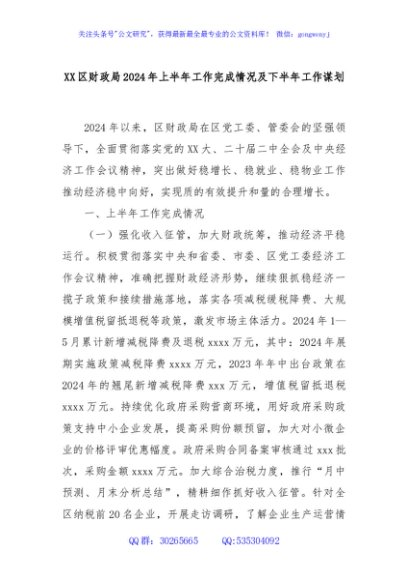 / XX区财政局2024年上半年工作完成情况及下半年工作谋划