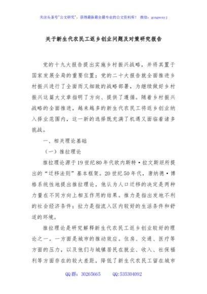 / 关于新生代农民工返乡创业问题及对策研究报告