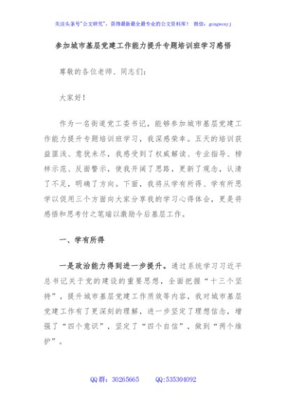 / 参加城市基层党建工作能力提升专题培训班学习感悟
