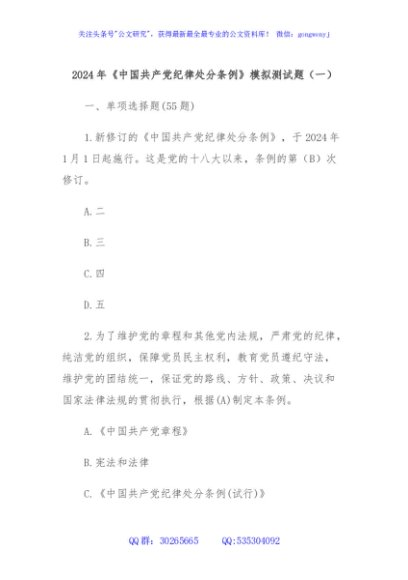 / 2024年《中国共产党纪律处分条例》模拟测试题(一)