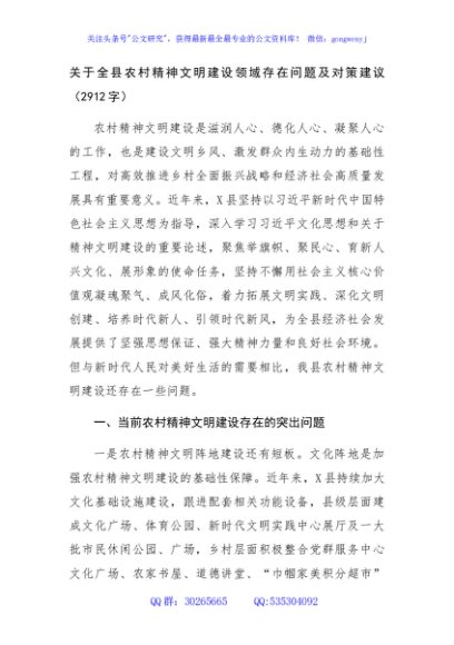 / 关于全县农村精神文明建设领域存在问题及对策建议(2912字)