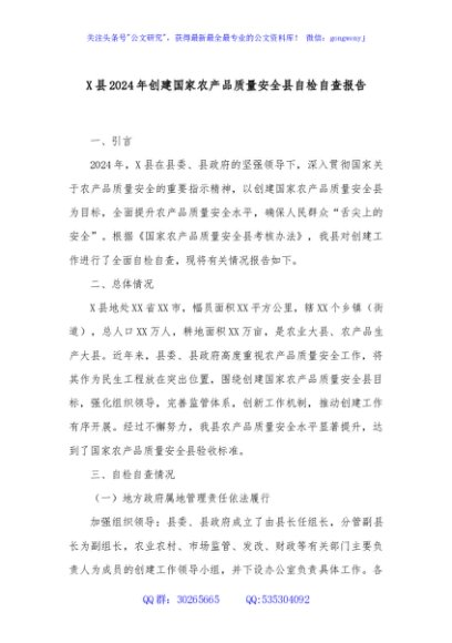 / X县2024年创建国家农产品质量安全县自检自查报告