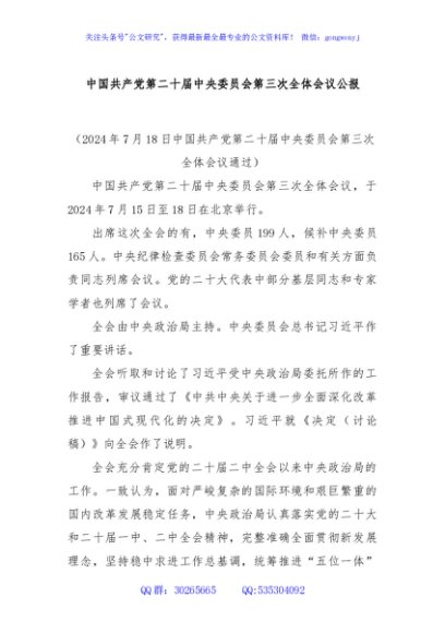 中国共产党第二十届中央委员会第三次全体会议公报