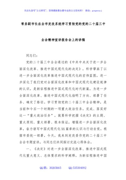 / 常务副市长在全市发改系统学习贯彻党的党的二十届三中全会精神宣讲报告会上的讲稿