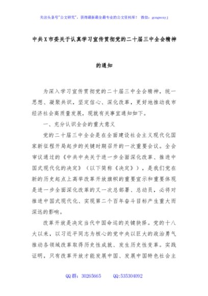 / 中共X市委关于认真学习宣传贯彻党的二十届三中全会精神的通知