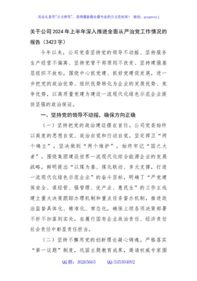 / 国企2024年上半年深入推进全面从严治党工作情况的报告(3423字)