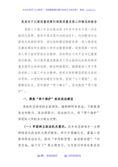 / 某局关于以高质量党建引领高质量发展工作情况的报告