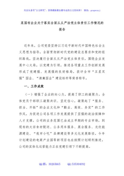 / 某国有企业关于落实全面从从严治党主体责任工作情况的报告