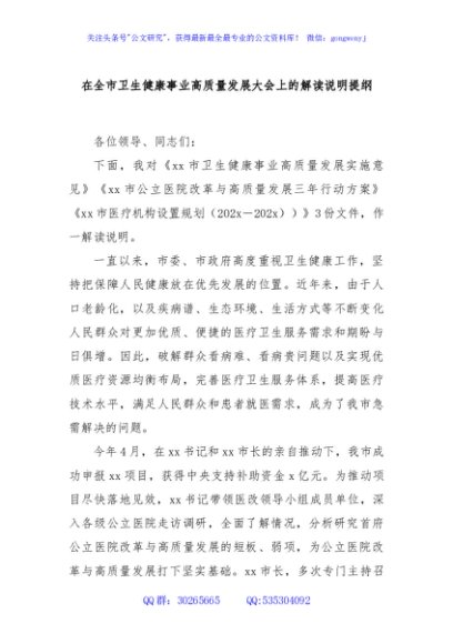 / 在全市卫生健康事业高质量发展大会上的解读说明提纲
