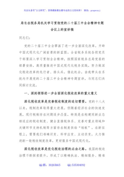 / 局长在税务局机关学习贯彻党的二十届三中全会精神专题会议上的宣讲稿