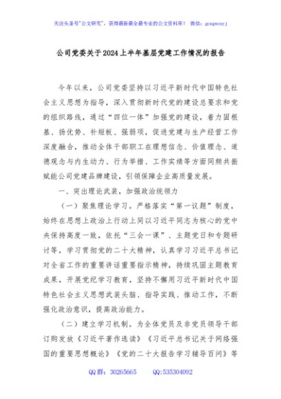 / 公司党委关于2024上半年基层党建工作情况的报告