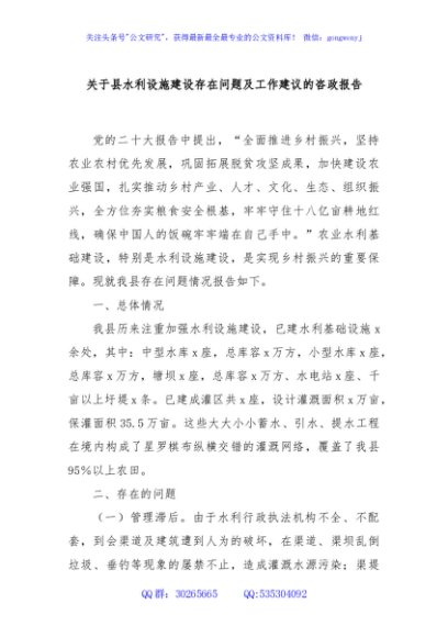 / 关于县水利设施建设存在问题及工作建议的咨政报告