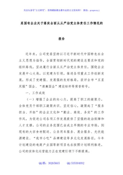 / 某国有企业关于落实全面从从严治党主体责任工作情况的报告