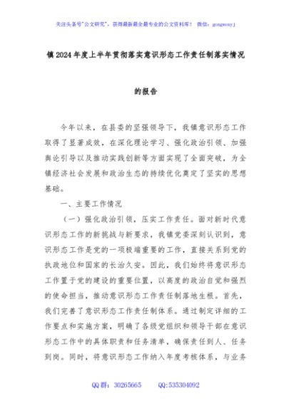 镇2024年度上半年贯彻落实意识形态工作责任制落实情况的报告