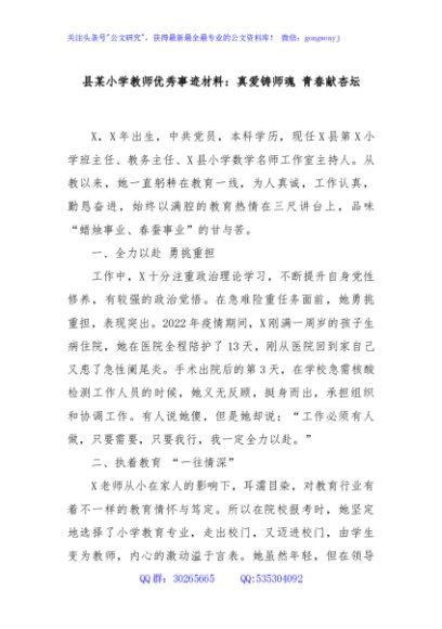 / 县某小学教师优秀事迹材料:真爱铸师魂 青春献杏坛