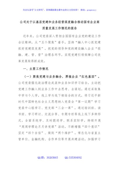 / 公司关于以基层党建和业务经营深度融合推动国有企业高质量发展工作情况的报告