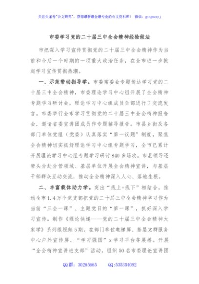 市委学习党的二十届三中全会精神经验做法