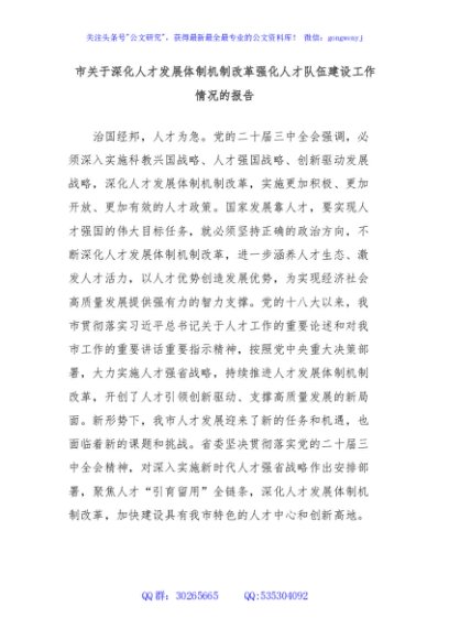 / 市关于深化人才发展体制机制改革强化人才队伍建设工作情况的报告