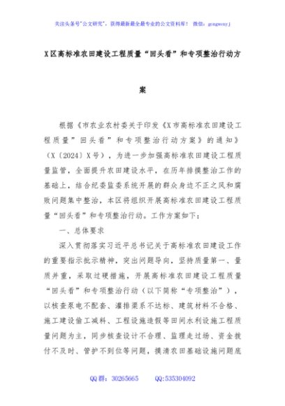 / X区高标准农田建设工程质量“回头看”和专项整治行动方案