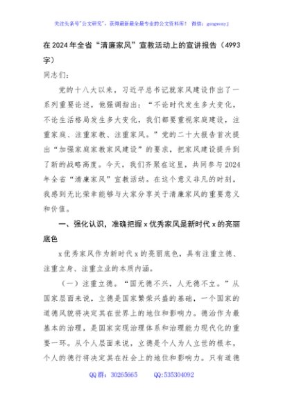 / 在2024年全省“清廉家风”宣教活动上的宣讲报告(4993字)