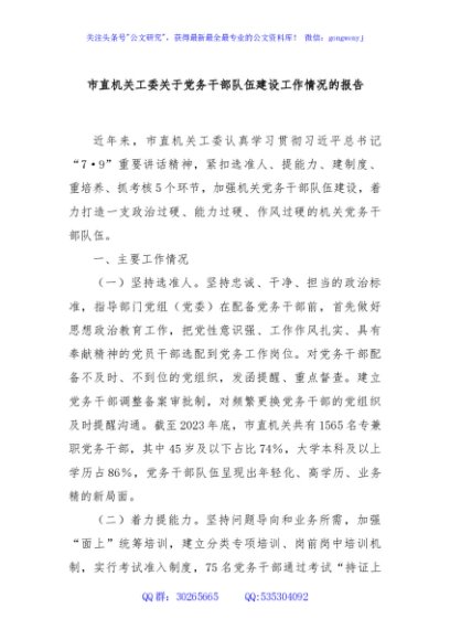 / 市直机关工委关于党务干部队伍建设工作情况的报告