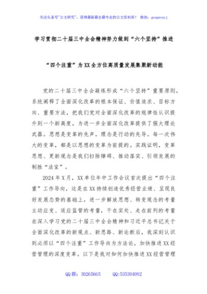 / 学习贯彻二十届三中全会精神努力做到“六个坚持”推进“四个注重”为XX全方位高质量发展集聚新动能