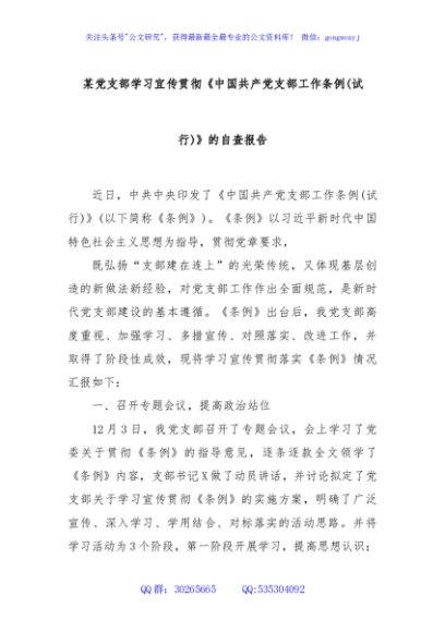 / 某党支部学习宜传贯彻《中国共产党支部工作条例(试行)》 的自查报告