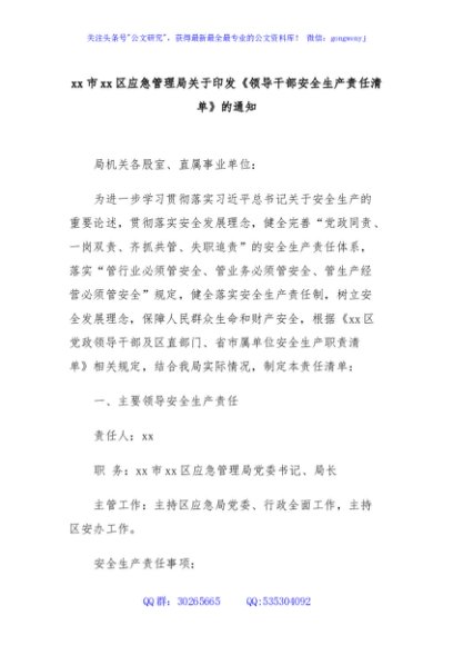 / xx市xx区应急管理局关于印发《领导干部安全生产责任清单》的通知