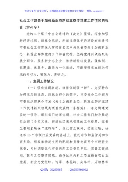 / 社会工作部关于加强新业态新就业群体党建工作情况的报告(2978字)