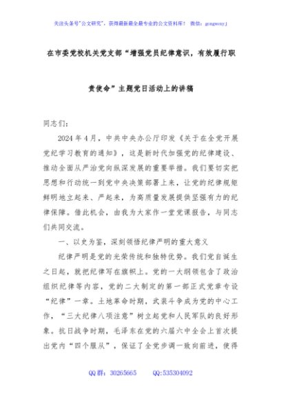 / 在市委党校机关党支部“增强党员纪律意识,有效履行职责使命”主题党日活动上的讲稿