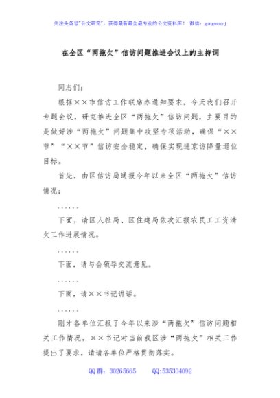 / 在全区“两拖欠”信访问题推进会议上的主持词