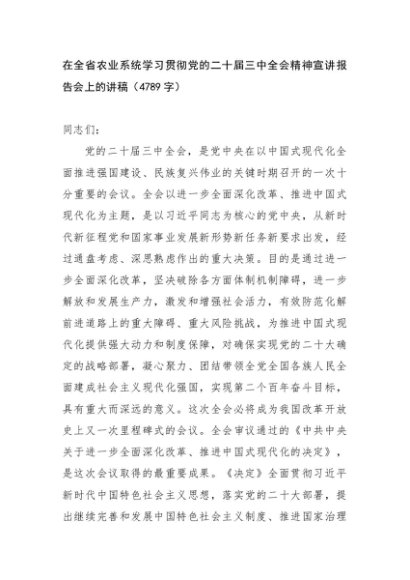 / 在全省农业系统学习贯彻党的二十届三中全会精神宣讲报告会上的讲稿(4789字)