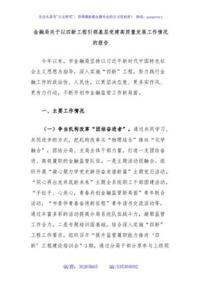 / 金融局关于以四新工程引领基层党建高质量发展工作情况的报告