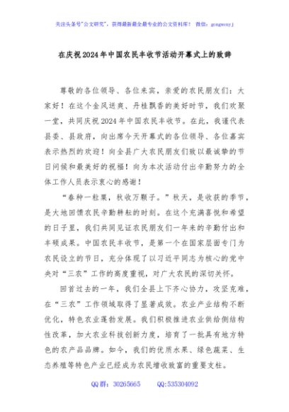/ 在庆祝2024年中国农民丰收节活动开幕式上的致辞