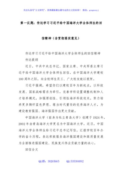 第一议题:传达学习习近平给中国海洋大学全体师生的回信精神(含贯彻落实意见)