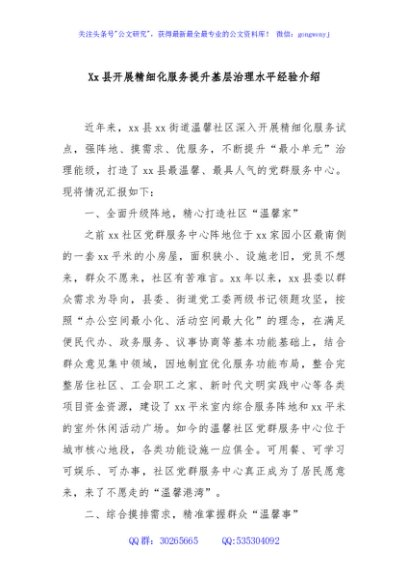 / Xx县开展精细化服务提升基层治理水平经验介绍