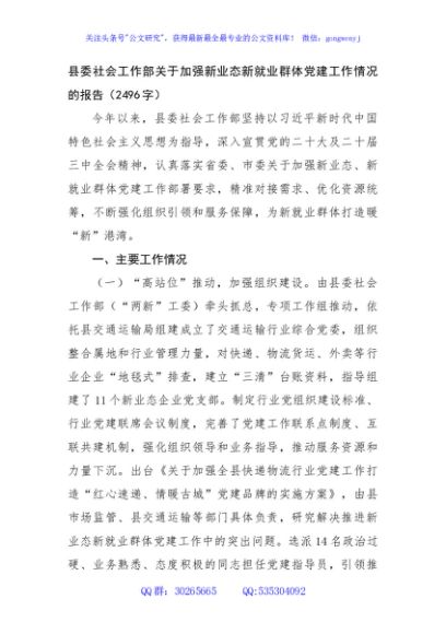 / 县委社会工作部关于加强新业态新就业群体党建工作情况的报告(2496字)