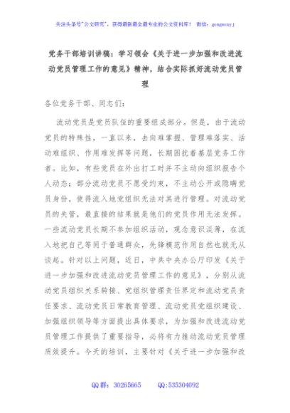 党务干部培训讲稿:学习领会《关于进一步加强和改进流动党员管理工作的意见》精神,结合实际抓好流动党员管理