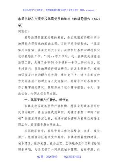 / 市委书记在市委党校基层党员培训班上的辅导报告(6672字)