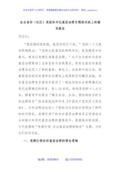 / 在全省村(社区)党组织书记基层治理专题培训班上的辅导报告
