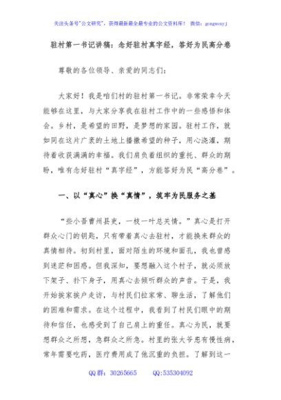 / 驻村第一书记讲稿:念好驻村真字经,答好为民高分卷