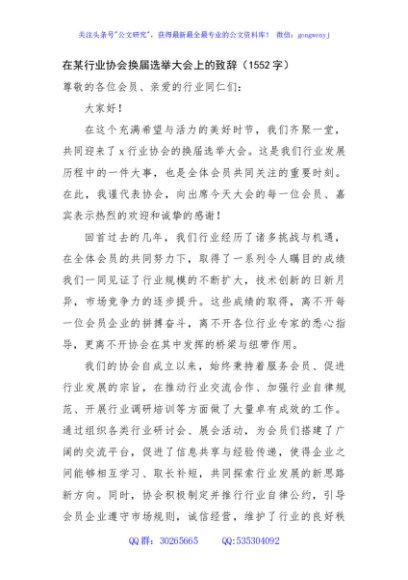 / 在某行业协会换届选举大会上的致辞(1552字)